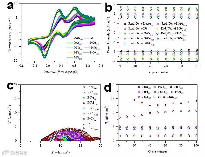 图4. 低铂合金对电极经连续100次CV和EIS循环测试的变化规律。