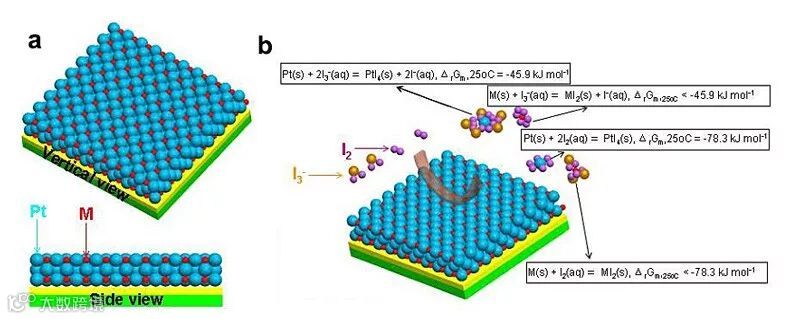 他们还通过热力学研究发现,过渡金属与电解质中的I3-以及I2等反应具有比金属铂更负的吉布斯自由能。因此,过渡金属与铂在电极表面形成了竞争溶解反应,有效抑制了铂原子的溶解,增加电极的稳定性。
