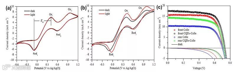 透明合金对电极为高效利用电池背面的反射光和散射光,提高发电总量提供了新的思路。研究发现,对电极表面的电子密度对于提升催化活性和电池效率具有极其重要的推动作用。在随后的工作中,唐群委教授课题组采用生物质转换碳量子点(CQDs)对透明CoSe合金的表面修饰制备了具有光致激发特性的透明合金对电极,在背面散射光照射下极大提高了催化活性(图3)。双面DSSC的背面电池效率提升至国际公开报道最高的7.01%,相关工作发表在Chem. Commun.(Chem. Commun., 2017, 53, 9894)上。