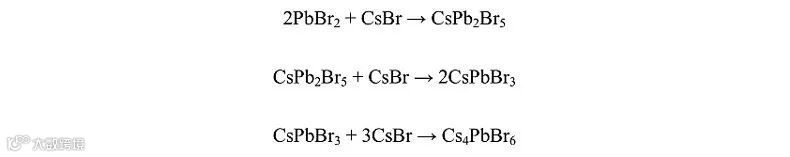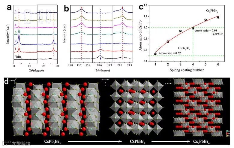 如图7所示,随着溴化铯旋涂次数的变化,无机钙钛矿薄膜的成分也在逐渐变化。通过XRD卡片比对以及EDS成分含量的测试,他们发现在多步旋涂过程中,薄膜实现了CsPb2Br5 → CsPbBr3 → Cs4PbBr6三相的转变。其主要的反应如下: