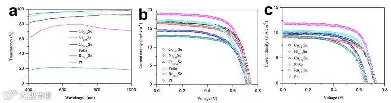 图2. 常规Pt对电极和透明MxSe合金对电极的(a)透光率及其双面DSSC在(b)正面和(c)反面光照下的J-V曲线。
