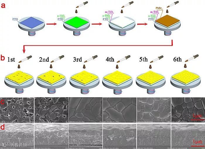 图6. 采用多步旋涂技术制备CsPbBr3薄膜的流程示意图以及不同旋涂次数时钙钛矿薄膜的SEM成像。