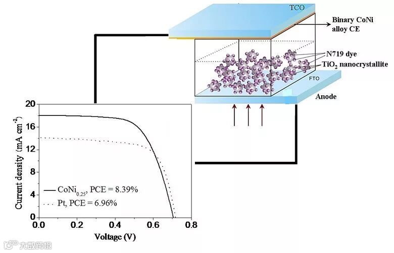 图1. 采用CoNi合金对电极制备的DSSC及其J-V 曲线。