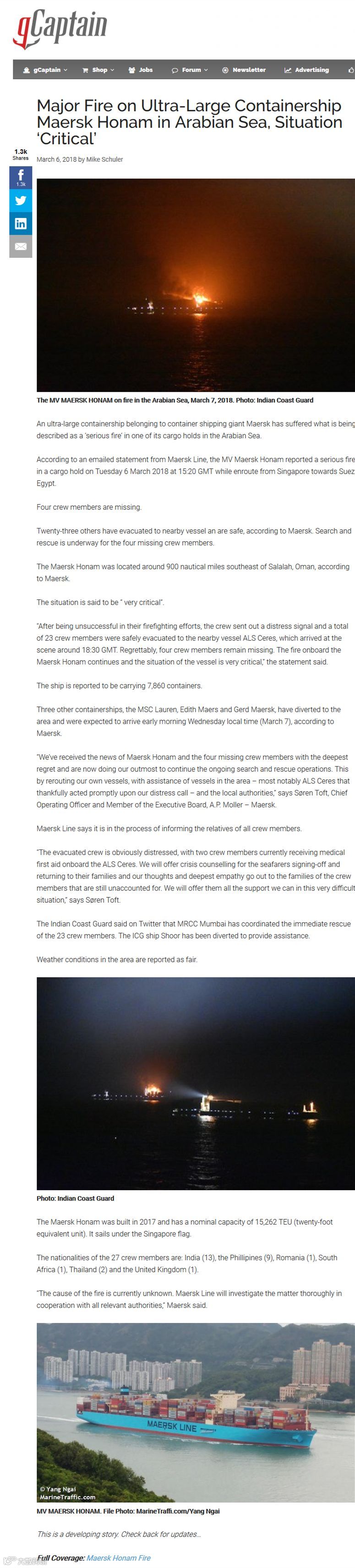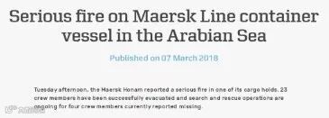 2018年3月6日星期二,格林威治标准时间15点20分,马士基航运旗下集装箱船舶“马士基浩南”轮报告其集货舱内发生严重火灾。该轮在从新加坡驶往苏伊士运河途中,目前位于阿曼塞拉莱(Salalah, Oman)东南900海里处。