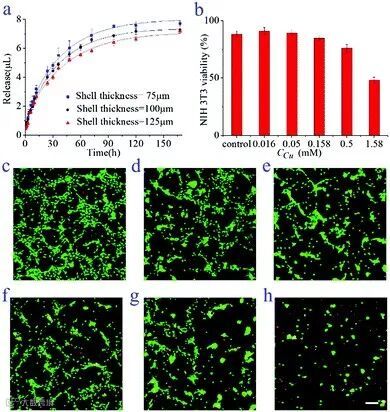 由于海藻酸盐水凝胶壳层的存在,而且其厚度可在制备时调节,维生素MOF水凝胶微纤维的释放过程温和且可控(下图a)。为了验证这种维生素MOF水凝胶微纤维在生物医学领域的应用,研究团队先测试了它的生物相容性。随着金属离子浓度的提高,材料的细胞毒性逐渐升高(下图b-h)。不过有趣的是,在金属离子浓度很低的情况下,细胞的存活率还有少量的增加,这可能是金属离子与维生素共同作用的结果。