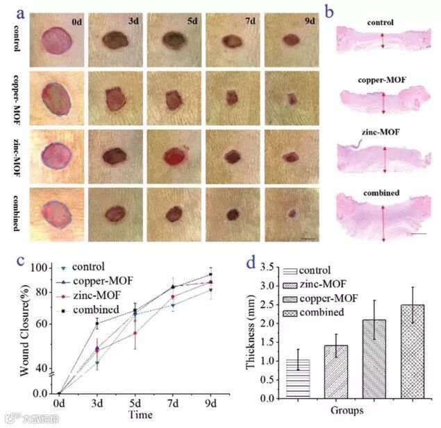 随后,研究团队测试了维生素MOF水凝胶微纤维的抗菌活性以及促进伤口愈合的能力。随着铜离子浓度的提高,铜-维生素MOF水凝胶微纤维可以有效降低大肠杆菌的存活率,因此可以预防环境中细菌感染伤口。而此前实验已经证明金属离子浓度越高,细胞毒性也就越高。最终通过实验,研究团队将铜离子浓度控制在0.158 mM,可以兼顾生物相容性和抗菌活性。另外,研究团队也验证了含锌离子的锌-维生素MOF水凝胶微纤维可保护细胞免受氧化损伤。最后,研究团队将锌-维生素及铜-维生素MOF水凝胶微纤维用于动物创伤模型,验证它们在促进伤口愈合中的实用价值。结果显示,用MOF微纤维治疗9天后,创面基本愈合,而对照组愈合的时间较长。而且组合使用锌-维生素及铜-维生素MOF水凝胶微纤维,比各自单独使用的愈合速度要快。这些结果证明这些MOF水凝胶微纤维的抗菌和抗氧化功能对伤口愈合的确有促进作用。