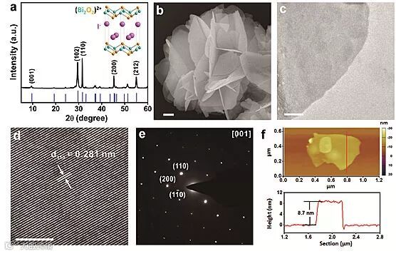 图2. BiOI纳米片的结构表征。包括 XRD、SEM、TEM、SAED以及AFM。