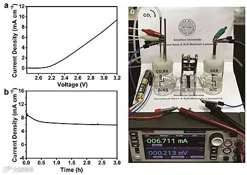 图6. 基于BiNS催化剂的CO2还原与水氧化的全反应体系测试。