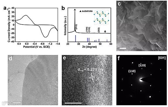 图3. BiOI电极的循环伏安曲线及拓扑还原后的Bi纳米片的结构表征。包括 XRD、SEM、TEM以及SAED。