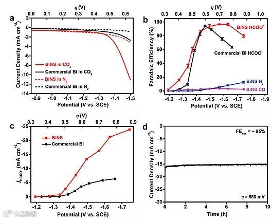 随后,作者针对性地比较了BiNS和商业铋两种催化剂的CO2还原电催化性能(图4)。电催化测试表明:在0.5 M NaHCO3中,BiNS催化剂能够在较低的过电位下高效地电催化还原CO2生成甲酸盐,产物最高法拉第效率接近100%,催化电流密度可以达到20 mA/cm2以上。此外,BiNS催化剂能够维持长达10小时以上的电催化性能,其优异的电催化性能超过了目前报道的大多数还原CO2至甲酸的电催化材料。