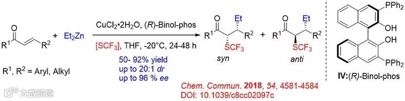 近日,南方科技大学化学系的汪君课题组报道了铜催化的1,4-加成/三氟甲硫基化不对称串联反应。在温和的反应条件下,在简单直链α,β-不饱和羰基化合物的alpha位引入三氟甲硫基。通过串联反应策略,实现了相邻C-C键和C-S键的对映选择性以及非对映选择性的高水平控制,以高达92%的收率,20:1的非对映选择性以及96%的对映选择性合成了一系列邻位含三氟甲硫基的手性羰基化合物,并将得到的加成产物进一步转化形成含有3个连续手性中心的仲醇和叔醇化合物。