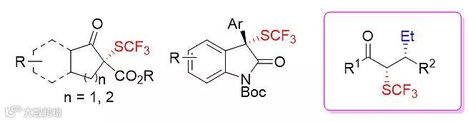 羰基是有机合成和药物化学中极为重要的官能团。基于三氟甲硫基的高电负性、亲酯性(π =1.44)以及代谢稳定性,较好的分子膜通透性和生物体内吸收速率等特殊性质,在羰基邻位引入三氟甲硫基基团是当今的研究热点之一。在过去的几年里,实现羰基邻位不对称三氟甲硫基化反应主要集中在beta-酮酸酯和氧化吲哚酮底物的研究,而针对于简单羰基化合物的羰基邻位不对称三氟甲硫基化反应的探索目前还处于萌芽阶段。其难点主要在于:1)相比于beta-酮酸酯和氧化吲哚酮化合物,简单羰基化合物的反应活性较低,在相似条件下很难实现不对称催化反应;2)当羰基邻位引入一分子的三氟甲硫基之后,由于三氟甲硫基具有一定的吸电子性,在温和的碱性条件下邻位含有三氟甲硫基的羰基化合物很容易生成烯醇式结构,一方面会进一步促进反应从而得到双三氟甲硫基化产物,另一方面在不对称环境下,会发生消旋化,很难实现高水平手性控制。因此实现简单羰基化合物的邻位不对称三氟甲硫基化反应具有重大研究意义。