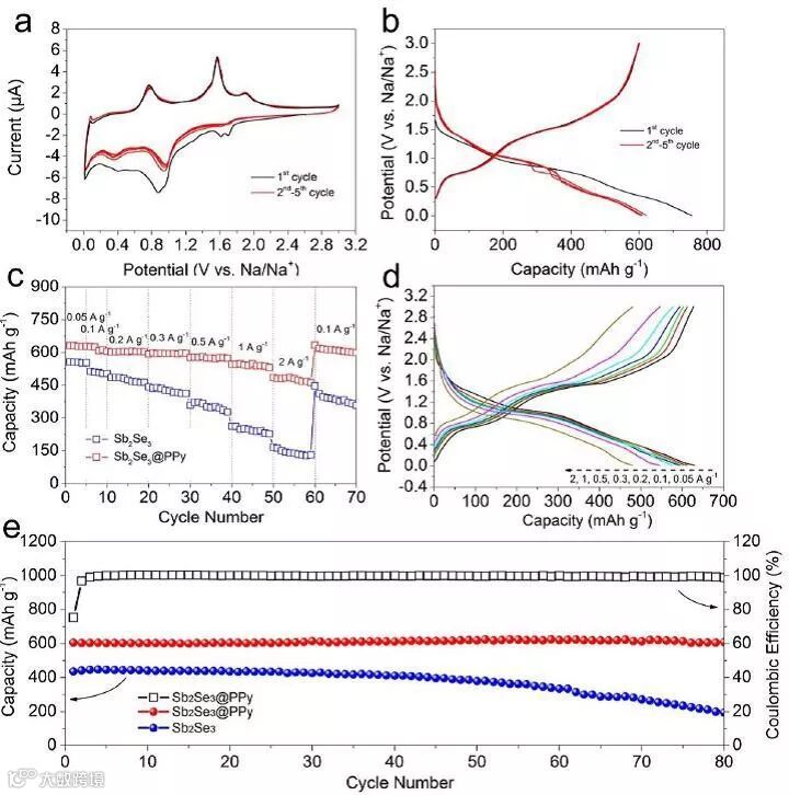 Sb2Se3和Sb2Se3@PPy材料的电化学性能测试。图片来源:Angew. Chem. Int. Ed. [17]