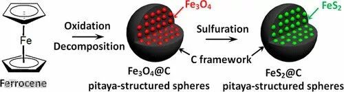2014年,研究者报道利用喷雾热解法制备的“火龙果状”Sn@C纳米复合材料,作为高速、长寿命锂离子电池的负极材料 [11];2015年,在氮掺杂石墨烯上均匀分散的Fe3O4纳米颗粒“葡萄状”结构被报道,Fe3O4纳米颗粒在微尺度上被3D互连的碳基底有效连接在了一起 [12];2016年,“西瓜状”具有分级缓冲结构的紧凑型锂离子电池负极硅/碳微球问世 [13];无独有偶,2017年,“火龙果状”FeS2@C复合材料以二茂铁为碳源及铁源利用原位封装和转换法被成功制备 [14];2018年,研究者提出了一种以硫为“促进剂”的简单路线,合成了“荔枝状”多孔Fe/N/C电极材料,并应用于高性能锌-空气电池中 [15]。