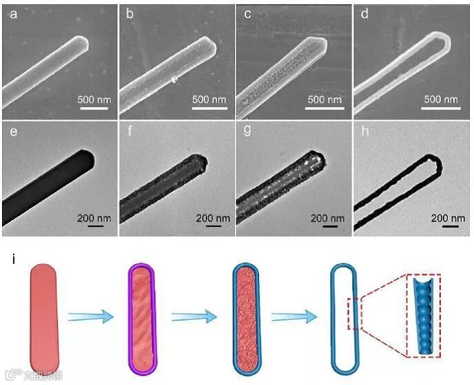 锑基高容量电极材料作为钠离子电池(SiBs)负极材料引起了人们的广泛关注。然而,锑基材料导电性较差,而且在储钠反应过程中体积变化严重,导致反应动力学较慢,循环性能不佳。研究人员以ZnSe(DETA)0.5为模板,通过与SbCl3进行阳离子交换反应,得到“曲别针状”的Sb2Se3电极材料。该结构的制备机理非常有趣,由于独特的位点选择性和扩散效应,离子交换过程使中间部分逐渐变薄,最后完全消失,形成了“曲别针”结构。随后,在“曲别针”表面包覆一层聚吡咯,提高了材料的导电能力和循环稳定性,一维的纳米尺寸也可以缩短钠离子和电子的扩散距离,提高电化学反应动力学,可谓一举多得。