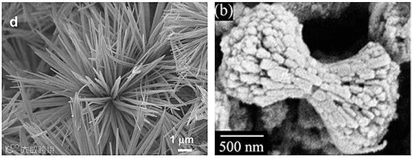 钴酸镍容易制备出针状形貌,不过通过简单的水热法,就可以使其组装成“蒲公英状”或“海胆状”电极。该电极不仅可以用于锂离子电池、超级电容器领域,而且具有光电流响应性,在光电化学电池中也有应用空间 [8]。
