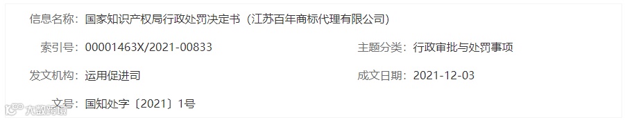 国家知识产权局行政处罚决定书(江苏百年商标代理有限公司)
