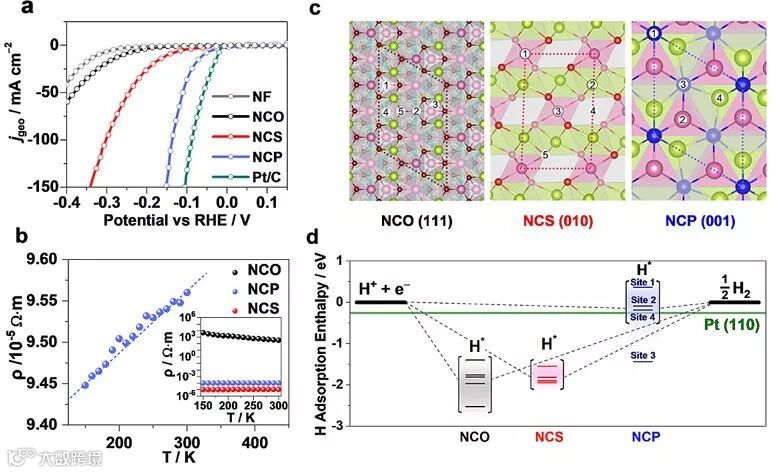 图2. 二维多孔NCO、NCS和NCP的(a)析氢LSV曲线;(b)变温电子导电率测试;(c)晶体结构;(d)氢吸附焓。