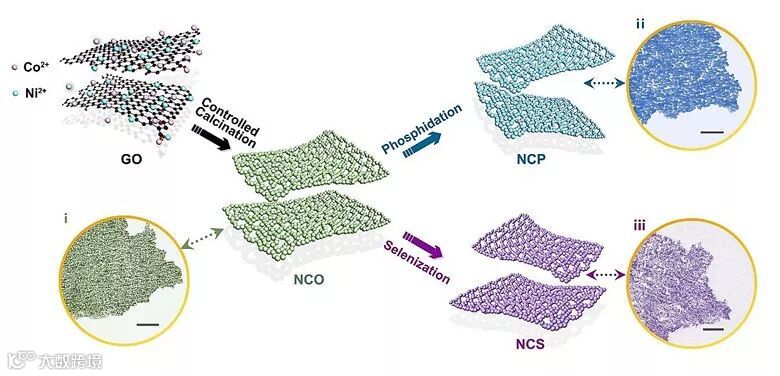 图1. 二维多孔NCO(i)、NCP(ⅱ)和NCS(ⅲ)纳米片的合成示意图(比例尺:200 nm)。