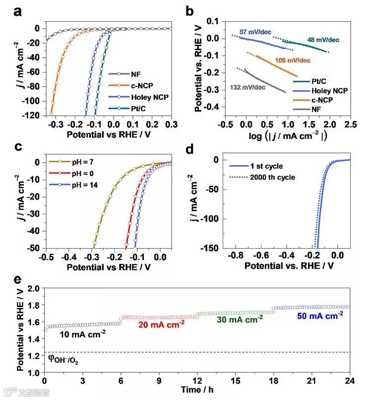 图3. 二维多孔NCP与对比样品在1.0 M KOH电解液中的(a)析氢CV曲线;(b)Tafel斜率;(c)二维多孔NCP在酸性、中性和碱性介质中的析氢CV曲线;(d)在1.0 M KOH电解液中HER稳定性的测试;(e)全分解水的稳定性测试。