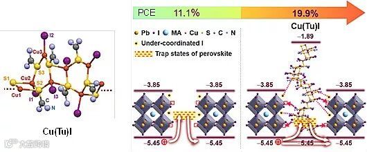 图5. 碘化亚铜配合物Cu(Tu)I的晶体结构及其作为缺陷态钝化材料提高钙钛矿太阳能电池效率的机理示意图。