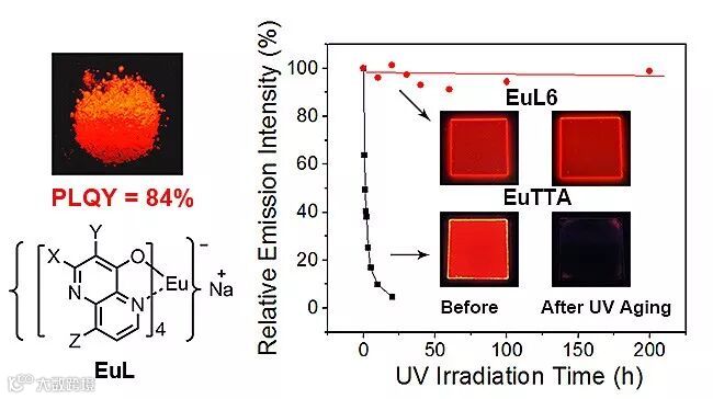 图1. 一类光稳定的铕配合物的结构通式、铕配合物在紫外灯下的成像及其与传统铕配合物光稳定性的比较。