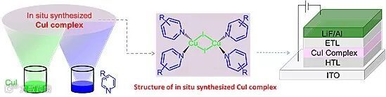 图3. 碘化亚铜配合物真空共蒸原位合成的新方法及其应用于OLEDs发光层的示意图。