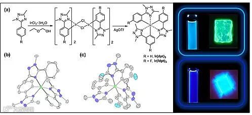 图2. 深蓝光铱配合物Ir(fdpt)3和对照化合物Ir(dpt)3的合成路线、晶体结构及其溶液和晶体在紫外灯下(365 nm)的发光成像。