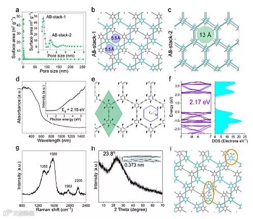 基于此,中科院青岛能源所研究团队首次设计合成了氟化的石墨炔二维碳材料。作者首先对材料的物理化学性质进行了详细的表征,如图1所示,通过对材料的孔径分布测试、紫外-可见漫反射光谱、XRD等分析以及相应的理论计算,分析了材料的AB堆积构型、带隙能以及层间距等重要参数。这些性质也为氟化石墨炔在储锂方面的优异性能奠定了基础。
