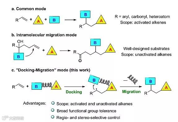 图1. 自由基参与的烯烃双官能团化反应模式