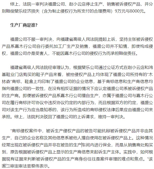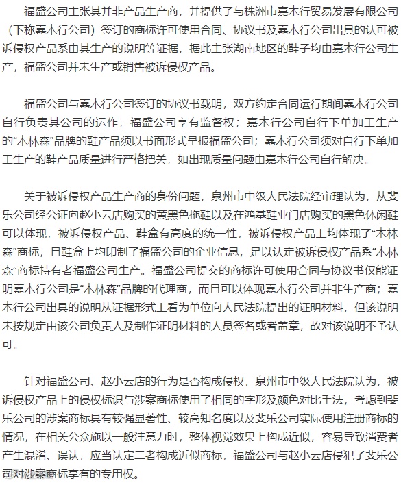 近日,双方纷争有了新进展,福建省高级人民法院判决驳回了福建石狮市福盛鞋业有限公司(下称福盛公司)的上诉请求,认定被诉侵权产品上体现了福盛公司所持有的“木林森”商标,鞋盒上印制了福盛公司的企业信息,应认定福盛公司系被诉侵权产品的生产商,其行为侵犯了斐乐体育有限公司(下称斐乐公司)对第163333号“FILA”商标(下称涉案商标)享有的专用权,应承担停止侵权并赔偿经济损失的责任。