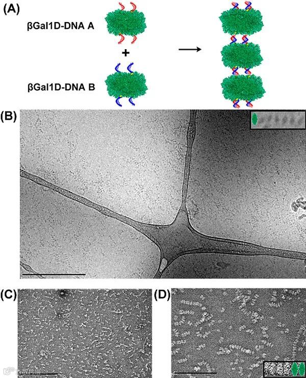 作者预测,使用一对短于4纳米的寡核苷酸(10碱基对),将其接到蛋白质表面,即可提供必要的驱动力来使DNA修饰的蛋白质定向组装。为了验证这一假想,他们设计了一个一维线性二价(bivalent)DNA-蛋白质结合体。所谓二价,指的是这种结构组件可以与另一个结构组件发生两次结合。作者选择的模型蛋白质是β-半乳糖苷酶(β-galactosidase,βGal),它具有D2对称性,在之前的研究中发现它在DNA功能化过程中足够稳定。作者对其进行了突变以获得便于研究的蛋白质突变体βGal1D,βGal1D再与马来酰亚胺封端的长度为10碱基对的一对互补寡核苷酸(DNA A和DNA B)分别反应,得到两种DNA-蛋白质结合体(βGal1D-DNA A和βGal1D-DNA B,下图B)。对于蛋白质突变以及随后的修饰过程,作者都进行了相关表征。