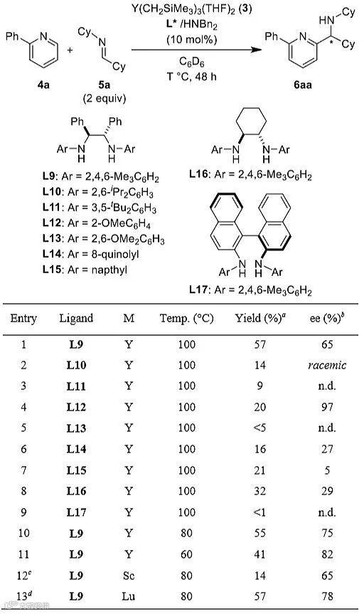 如三(双三甲基硅基氨基)钇Y[N(SiMe3)2]3(1)或钇配合物Y[N(SiMe3)2]2(NBn2)(THF)(2)可用作2-取代吡啶与亚胺邻位C-H键氨基烷基化的催化剂,,其中配合物2比配合物1具有更高的活性。作者利用1当量不同的螯合双齿二胺及三齿三胺作为配体分别与Y(CH2SiMe3)3(THF)2(3)混合,得到的配合物用以考察邻位C-H键氨基烷基化反应的催化活性。他们发现N,N'-双(2,6-二异丙基苯基)乙二胺(L1)是效果最好的螯合配体。