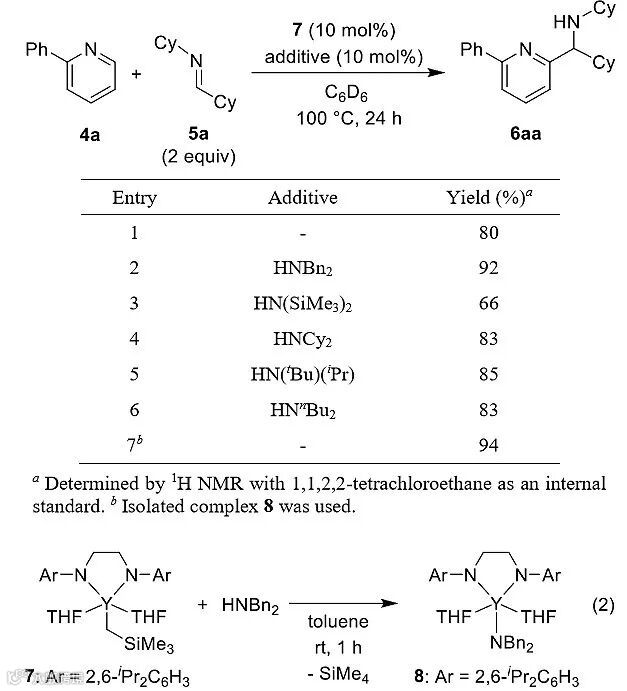 作者发现第3族金属和镧系元素的均配型三酰胺络合物可作为催化剂,在HNBn2的存在下将非活化的亚胺选择性插入2-芳基吡啶吡啶环的邻位C-H键。
