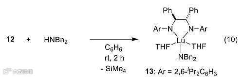 作者也提出了HNBn2存在时的反应机理,配合物7先和HNBn2反应生成配合物8',8'和THF反应消除HNBn2,同时生成配合物A。A再和亚胺5反应,消除4,同时生成配合物B,B再和HNBn2反应生成产物,同时重生配合物8',由此完成催化循环。