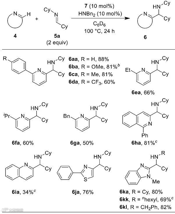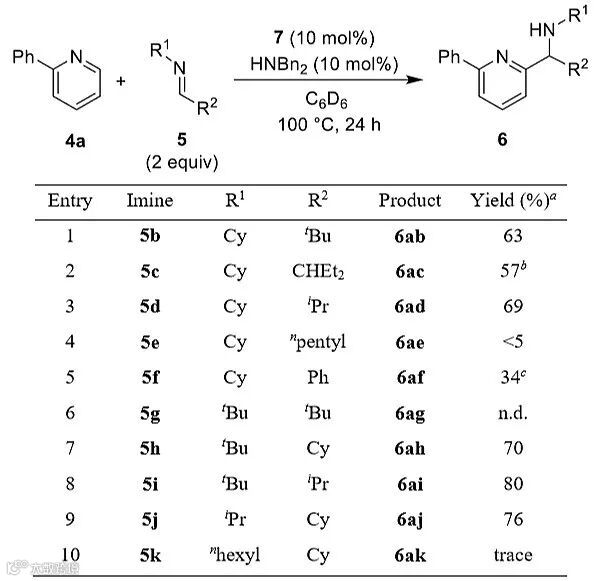 有了最佳的反应条件,作者在10 mol%的配合物7和10 mol%的HNBn2存在下,固定底物2-苯基吡啶化合物4a,对不同亚胺化合物的反应活性进行考察,反应以氘代苯作为溶剂在100 ℃下进行。他们发现,不同的R1和R2取代基对反应结果存在较大的影响。当R1为环己基、R2为正戊基时,产率急剧下降,小于5%,可能是由于钇配合物优先和亚胺反应导致催化剂分解(entry 4)。当R1和R2都为叔丁基时,由于位阻原因,反应也不能发生(entry 6)。