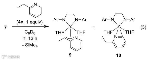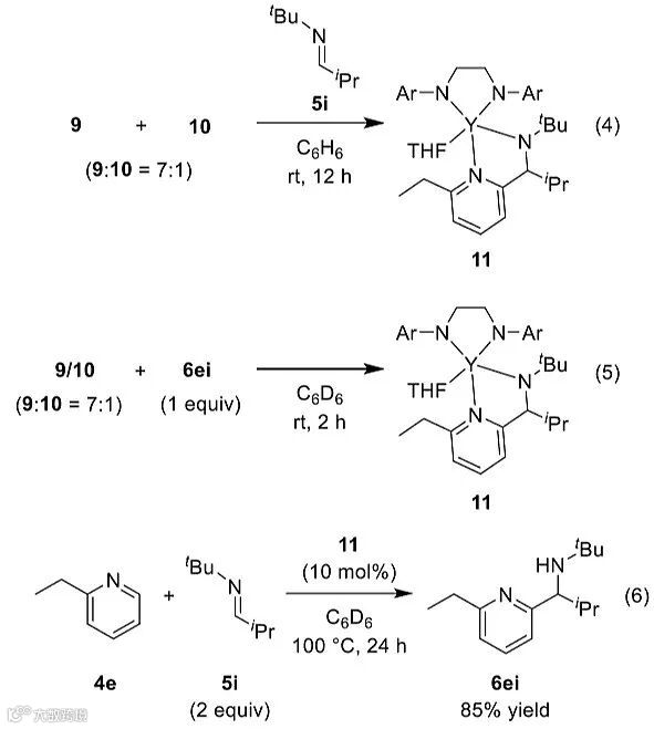 为了进一步验证以上机理,作者还设计了一系列的控制实验。钇配合物7和1当量的2-乙基吡啶4e反应,可生成η3-吡啶甲基钇配合物9和η2-钇配合物10,其中9和10的比例为7:1,9和10的混合物与5i反应,会以85%的收率得到单一的五元环鳌合的配合物11,9和10的混合物与氨基烷基化的产物6ei反应,能定量地得到配合物11,而4e和5i可以在10 mol%配合物11的作用下反应24小时,以85%的产率得到相应的产物6ei。配合物11的结构也通过X射线单晶衍射分析予以确证。