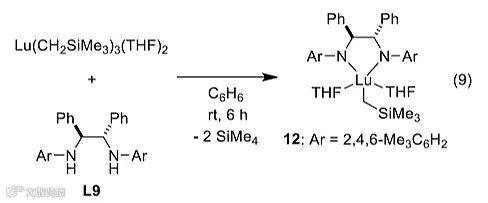 Lu配合物和手性配体L9在苯作为溶剂时室温下反应6小时,能得到新的Lu配合物12,并通过X射线单晶衍射分析确定了其结构。12和HNBn2在苯作为溶剂时室温下反应2小时,可生成新的配合物13,13可以催化吡啶衍生物的不对称氨基烷基化反应。他们还对底物的适用范围进行考察,2位包含不同取代苯基的吡啶化合物和两当量的亚胺5a反应,能以中等的产率和较好的ee 值得到手性的氨基烷基化产物6。