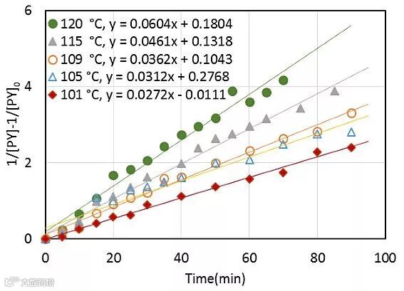 2-苯基吡啶在不加入HNBn2的情况下5种不同温度下的二级曲线