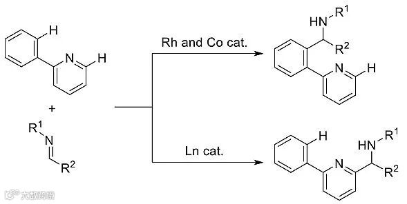 图2. 过渡金属催化2-苯基吡啶和亚胺反应不同的区域选择性。图片来源:J. Am. Chem. Soc.