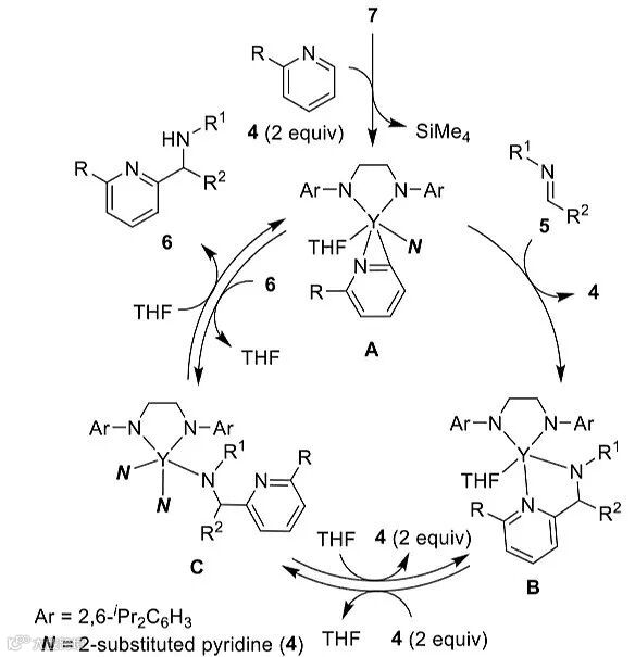 根据实验结果,作者还提出了反应可能的机理,钇配合物7先与2当量的吡啶衍生物结合,消除四甲基硅,生成新的配合物A。A和亚胺5反应,消除一分子4,同时生成配合物B,B再和2当量的4反应,消除THF,同时生成配合物C。C和THF反应生成产物6,同时重生配合物A完成催化循环。