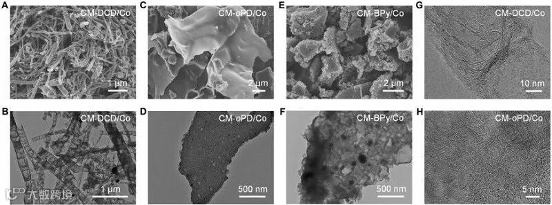 图3. 碳材料的形貌。(A,B)CM-DCD/Co的SEM和TEM照片。(C,D)CM-oPD/Co的SEM和TEM照片。(E,F)CM-BPy/Co的SEM和TEM照片。(G)CM-DCD/Co的HRTEM照片。(H)CM-oPD/Co的HRTEM照片。