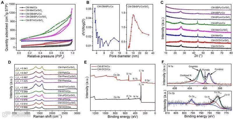 图4. 碳材料的结构和组分表征。(A)几种碳材料的N2吸附-脱附曲线。(B)CM-DBrBPy/Co和CM-DBrBPy/Co/SiO2的孔径分布曲线。(C)几种碳材料的XRD图谱。(D)碳材料的拉曼谱。(E)CM-DCD/Co和CM-BTH/Co的XPS曲线。(F)CM-DCD/Co 的N 1s 峰 和 Co 2p 峰 的XPS分峰曲线。