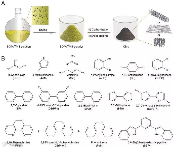 图1. 碳材料的制备方法。(A)过渡金属盐辅助碳化有机小分子制备碳纳米材料的示意图。(B)该方法所使用的有机小分子前驱物的结构。