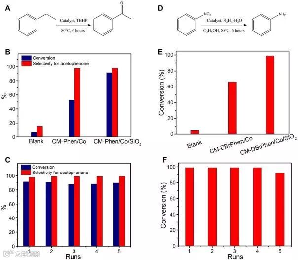 图5. 碳材料在选择性氧化乙苯和氢化硝基苯的催化应用。(A)选择性氧化乙苯的反应方程式。碳材料催化氧化乙苯的活性(B)和稳定性(C)。(D)氢化硝基苯的反应方程式。碳材料催化氢化硝基苯的活性(E)和稳定性(F)。