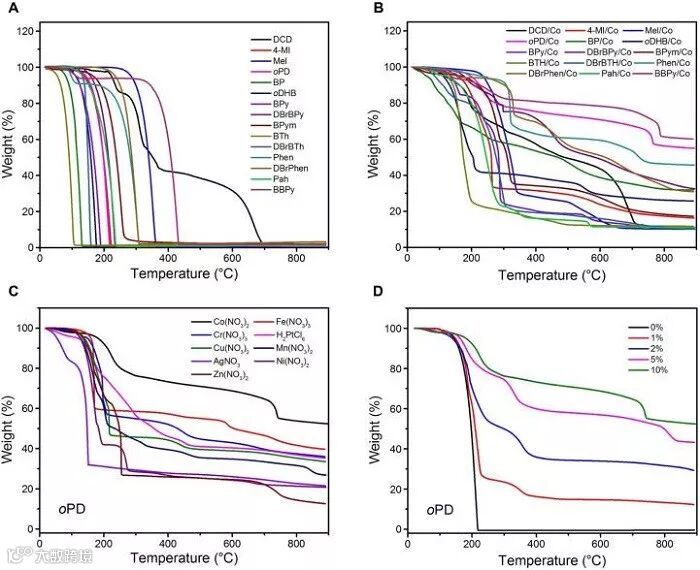 图2. 热重分析。(A)在N2气氛下有机小分子的TGA曲线。(B)在N2气氛下有机小分子与Co(NO3)2混合物的TGA曲线。(C)在N2气氛下oPD与不同过渡金属盐混合物的TGA曲线。(D)在N2气氛下oPD与不同含量Co(NO3)2混合物的TGA曲线。