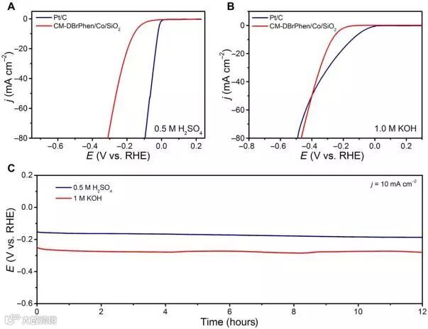 图6. 碳材料催化HER的性能。(A)CM-DBrPhen/Co/SiO2和商业化 Pt/C在0.5 M H2SO4溶液中的极化曲线。(B)CM-DBrPhen/Co/SiO2和商业化 Pt/C在1 M KOH溶液中的极化曲线。(C)在0.5 M H2SO4和1 M KOH 中,CM-DBrPhen/Co/SiO2在10 mA cm-2 的计时电压曲线。