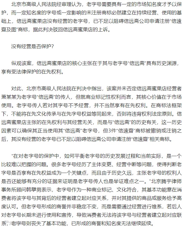 近日,北京市高级人民法院作出二审判决,认为老字号传人若对其字号不予经营并不当然享有在先权利,在信远斋蜜果店的3件“信遠齋”商标被撤销或注销之后,其没有经营的老字号已不足以阻碍信远斋公司申请注册“信遠齋及图”商标。