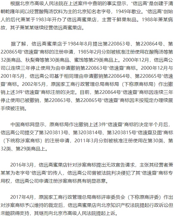 早在2000年,信远斋蜜果店经营者萧某某以信远斋公司侵犯其对“信遠齋”商标享有的专用权为由向法院提起诉讼,法院认定信远斋公司将“信远斋”文字作为商标使用在其生产、销售的商品的包装上,并突出使用其企业名称中的字号“信远斋”的行为,侵犯了信远斋蜜果店对“信遠齋”商标享有的专用权。萧某某与信远斋公司均不服,向北京市高级人民法院提起上诉,但未能获得法院支持。