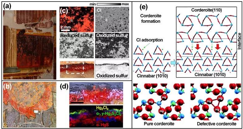 Hg-Cl次级产物的形成/降解途径如图1所示。在光照和湿气中,环境中的氯被化学吸附到α-HgS表面,并形成多种Hg-S-Cl相的生长,然后形成较稳定的α-Hg3S2Cl2。在α-HgS/α-Hg3S2Cl2界面,明显的晶格错配出现,促进了α-Hg3S2Cl2中结构不稳定的形成并释放出黑色的Hg0。另一条路径是形成发白的Hg2Cl2/HgCl2,在光照下也会释放黑色Hg0。
